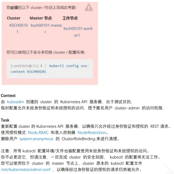 root@master:~$ cp /etc/kubernetes/manifests/kube-apiserver.yaml /tmp/ root@master:~$ vim /etc/kubernetes/manifests/kube-apiserver.yaml 修改为 - --authorization-mode=Node,RBAC - --enable-admission-plugins=NodeRestriction - --anonymous-auth=false