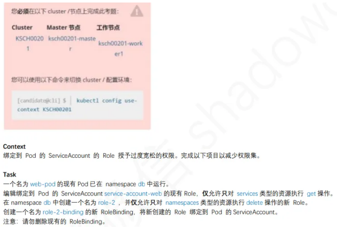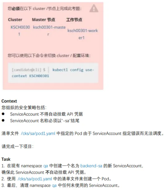 linux@node1:~$ vim /cks/sa/pod1.yaml apiVersion: v1 kind: Pod metadata: name: backend namespace: qa spec: serviceAccountName: backend-sa 认已有这⼀⾏,需要修改。) containers: - image: nginx:1.9 imagePullPolicy: IfNotPresent name: backend linux@node1:~$ kubectl apply -f /cks/sa/pod1.yaml linux@node1:~$ kubectl get pods -n qa NAME READY STATUS RESTARTS AGE backend 1/1 Running 0 117s qatt 1/1 Running 3 (46m ago) 24d