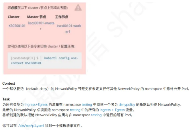 | linux@node1:~$ kubectl config use-context KSCS00101 linux@node1:~$ vim /cks/net/p1.yaml apiVersion: networking.k8s.io/v1 kind: NetworkPolicy metadata: name: denypolicy namespace: testing spec: podSelector: {} policyTypes: - Ingress - Egress linux@node1:~$ kubectl apply -f /cks/net/p1.yaml linux@node1:~$ kubectl describe networkpolicy denypolicy -n testing