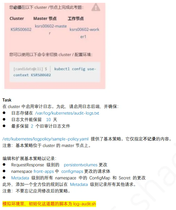 1、切换环境 linux@node1:~$ ssh master linux@master:~$ sudo -i root@master:~$ cp /etc/kubernetes/logpolicy/sample-policy.yaml /tmp root@master:~$ cp /etc/kubernetes/manifests/kube-apiserver.yaml /tmp