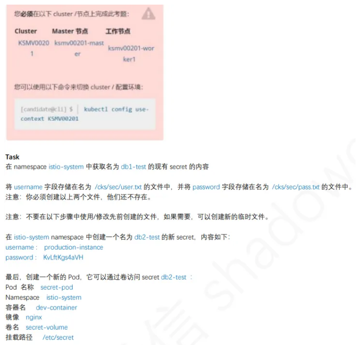 linux@node1:~$ kubectl get secrets db1-test -n istio-system -o yaml linux@node1:~$ echo 'ZGIx' | base64 -d > /cks/sec/user.txt linux@node1:~$ echo 'aGVsbG8=' | base64 -d > /cks/sec/pass.txt linux@node1:~$ cat /cks/sec/user.txt db1linux@node1:~$ cat /cks/sec/pass.txt hellolinux@node1:~$