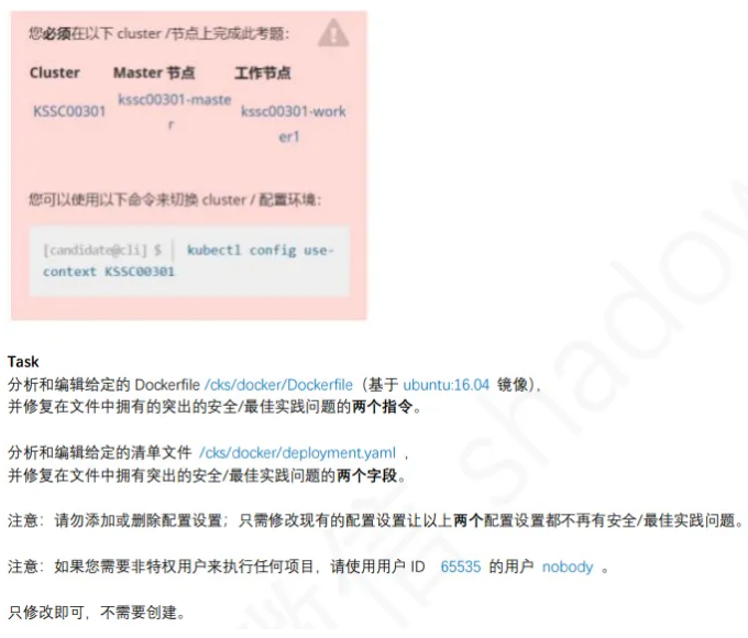linux@node1:~$ vim /cks/docker/Dockerfile FROM ubuntu:22.04 USER nobody