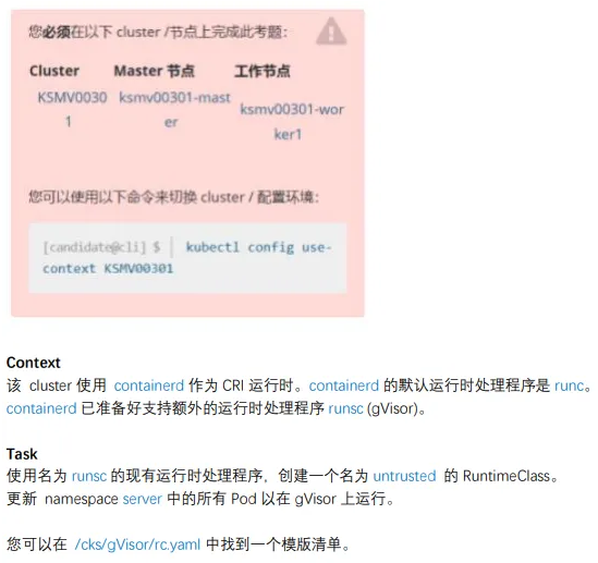 1 、创建RuntimeClass linux@node1:~$ vim /cks/gVisor/rc.yaml apiVersion: node1.k8s.io/v1 kind: RuntimeClass metadata: name: untrusted handler: runsc linux@node1:~$ kubectl apply -f /cks/gVisor/rc.yaml linux@node1:~$ kubectl get RuntimeClass NAME HANDLER AGE untrusted runsc 4m32s